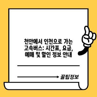 고속버스를 통해 빠르고 편리하게 천안과 인천 사이를 이동할 수 있는 방법이 있습니다. 고속버스를 이용하면 혼잡한 도로를 피해 시간에 맞춰 편안하게 이동할 수 있으니 많은 이용자들이 선호하게 되었답니다. 이번 글에서는 천안에서 인천으로 가는 고속버스 시간표, 요금, 예매 방법, 할인 정보 등을 자세히 안내해 드리겠습니다.